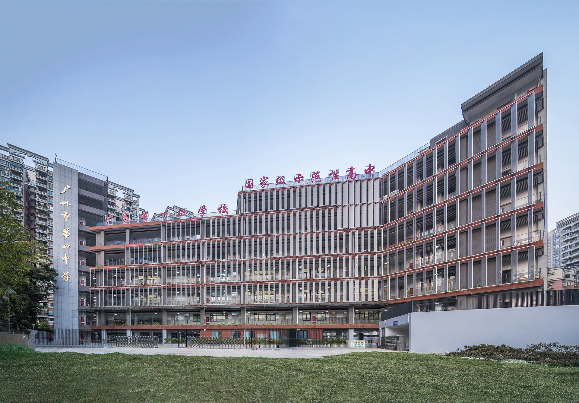 项目用地位于广州荔湾老城中心,紧邻荔湾湖公园与泮塘五约旧村。因泮塘五约村及周边地区控规调整,洋塘路东侧的原富力广场地块配套中学地块规划为广州四中新校区建设用地,周边具有荔枝湾涌、古玩城、荔湾湖公园、仁威庙、泮塘五约村等丰富的历史文化资源。由于用地极其紧张,且属于历史文化街区的建控地带。设计从关注场地高密度特征出发,从历史中学习岭南园林在寸土之地造景的设计智慧,运用“高树深池”之意向,充分考虑广州亚热带气候特征,体量设计巧妙借助东南季风,鼓励建筑自然通风;立面运用竖向穿孔百叶与横向廊道的复合系统处理西向的遮阳需求;以立体庭院组织功能流线,最大限度地营造半室外的活动场所。¥ 0.00立即购买