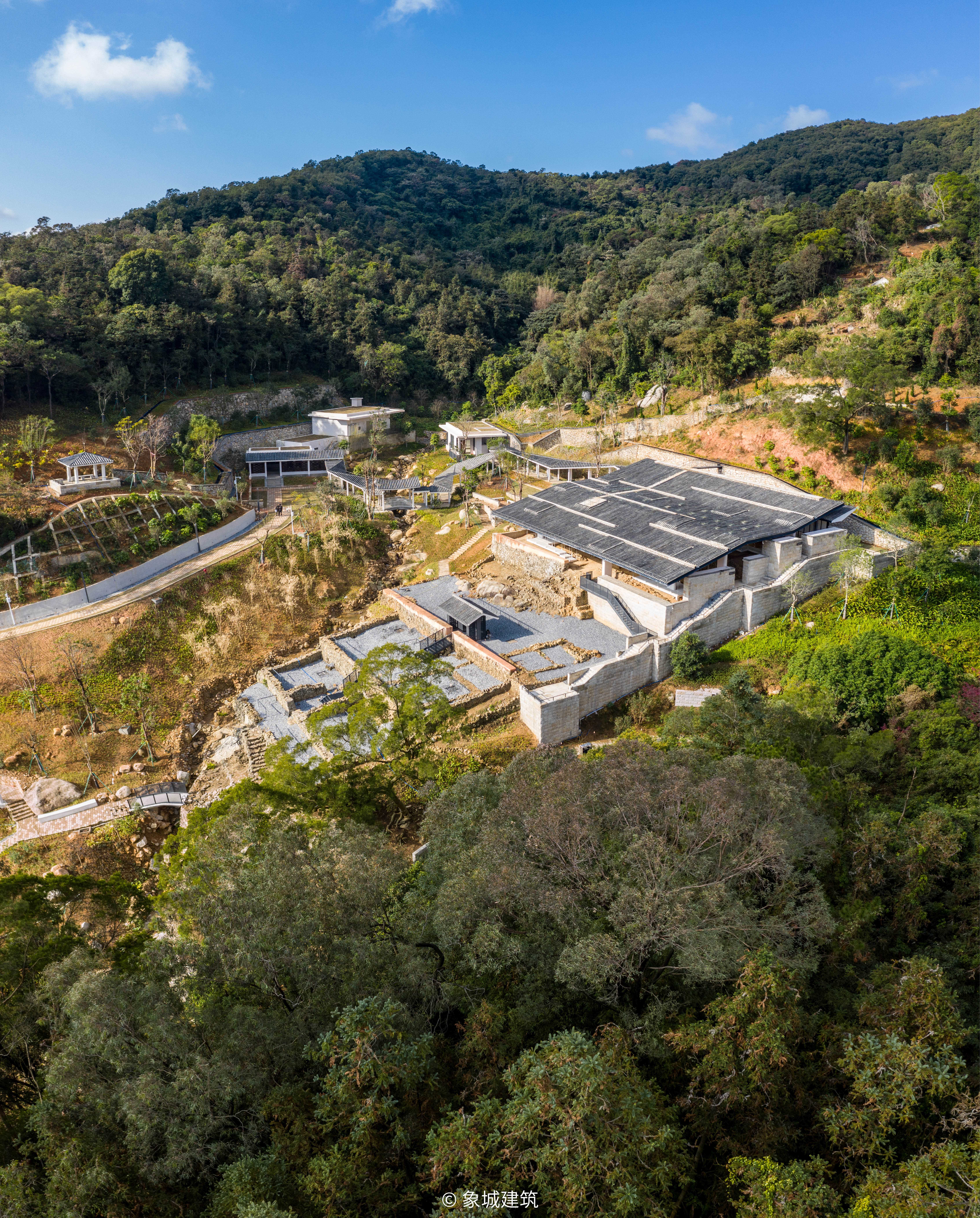 莲花书院位于广州增城南香山东南山麓,相传是明代理学家湛若水兴建莲花书院的地方。2016年政府决定在原址重建书院,要求根据文献恢复古制,再现传统书院选址和山水的关系,以及书院的布局结构。象城建筑完成了原项目要求的书院设计后,2018年项目进行施工前的考古发掘,现场发现了规模大、保存好的莲花书院遗址,并列入“南粤古驿道十五大考古发现”。项目随后转为“遗址保护与展示利用”,象城建筑对此进行了全新的设计讨论。 遗址主体是纵横连续的石砌墙体,落在五进地台逐级而上,前三进墙体略断续,后两进保存更完整,其间是散落的柱础、石刻等构件。设计将前三进遗址作室外展示,后两进增设顶棚,加强保护并作室内展示。 设计强调真实性和可识别性原则。为避开遗址的实墙,后两进的顶棚采用散点落柱,并通过两个方向的椭圆柱,既暗示了原有体量,又削弱了开间的概念;顶棚敷设1×1米的网格预埋系统,便于悬挂栈道,浮于遗址之上。¥ 0.00立即购买